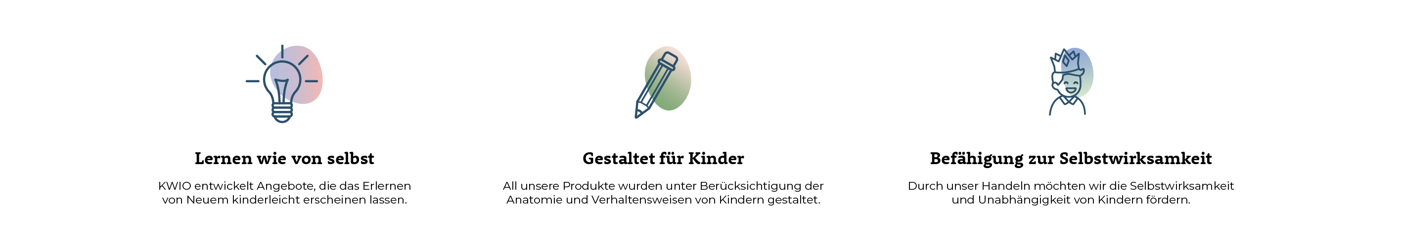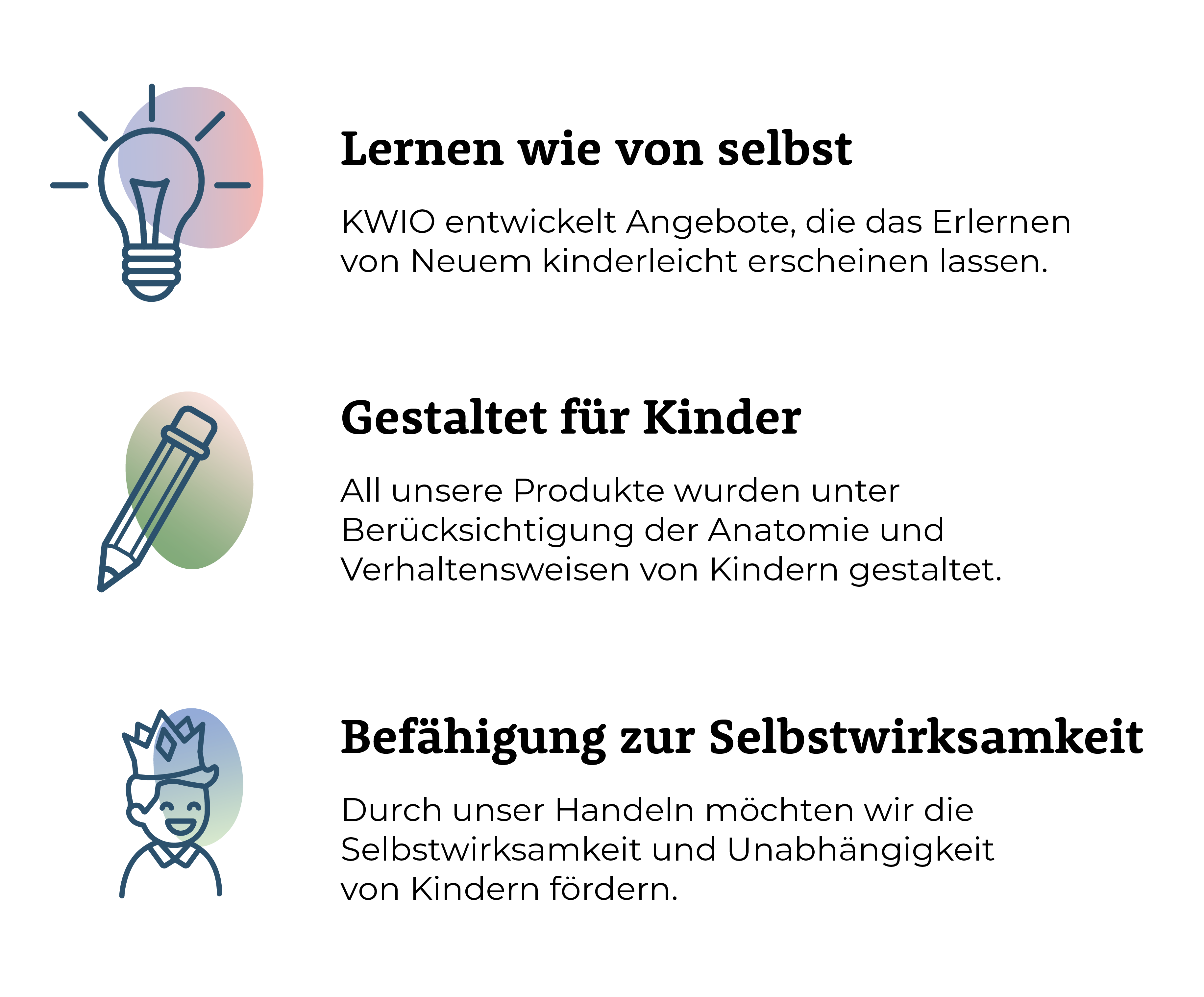 KWIO wird immer dafür stehen, dass das Design über modische Aspekte hinausgeht und auf Langlebigkeit und kindgerechte Funktionalität ausgelegt ist. Dekorfreie, hochwertige Produkte stehen für elterliches Qualitätsbewusstsein, sind aber für den Gebrauch von Kindern gestaltet. Unsere Produkte sind weder Spielzeug noch Mode, sondern langlebige Werkzeuge, die sinnvolle Lernerfahrungen und die Selbstwirksamkeit von Kindern fördern.