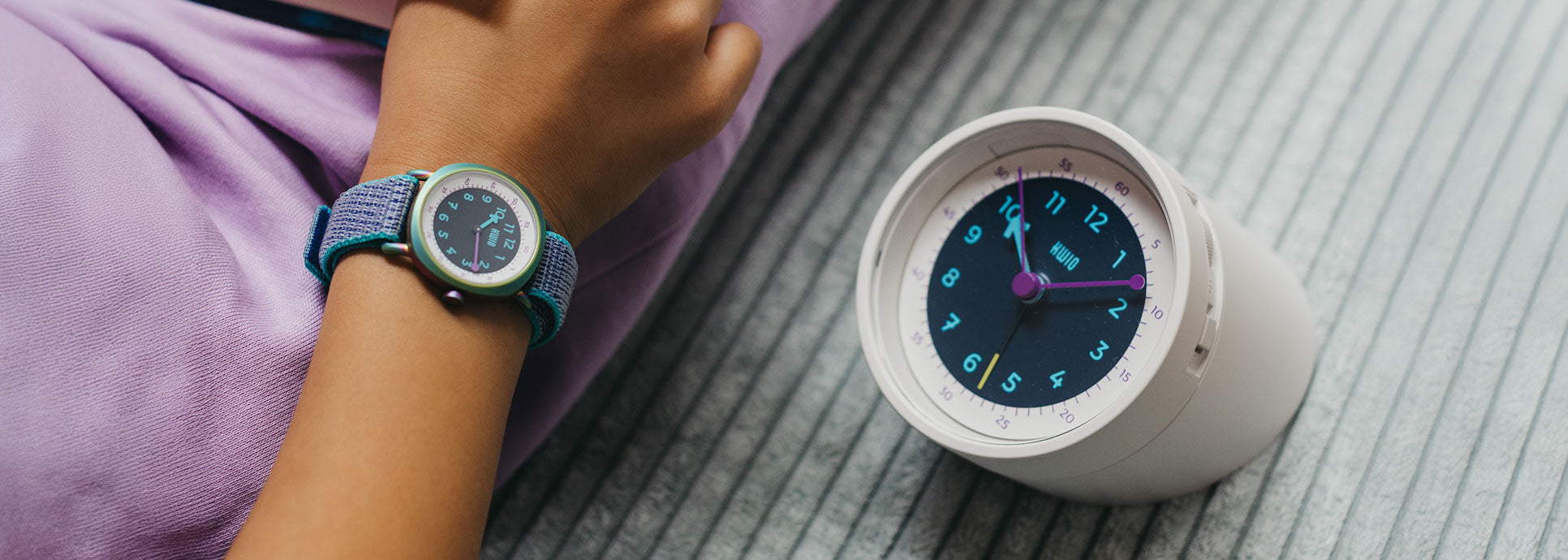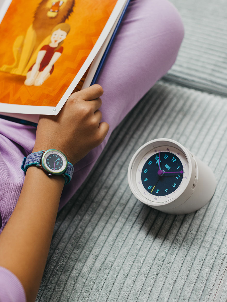 Der Wecker RRING ist passend zur Armbanduhr TIKK gestaltet. Das vertraute Ziffernblatt fördert den Lernprozess beim Uhr lesen durch Wiedererkennung.