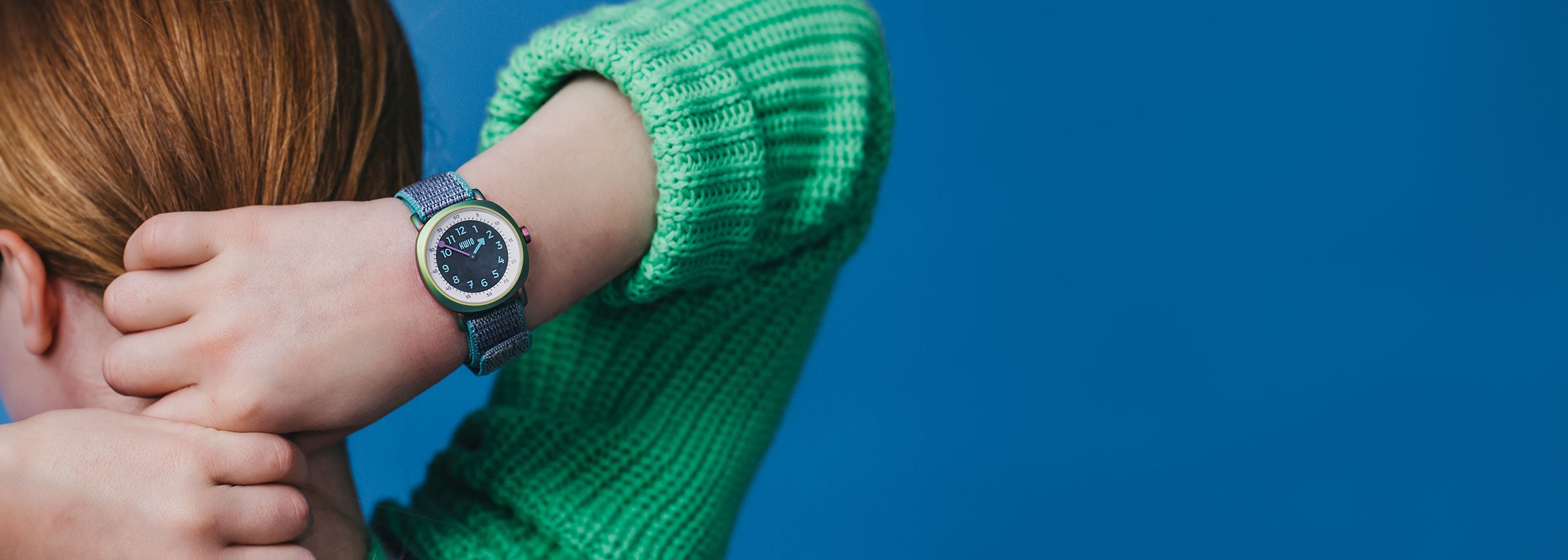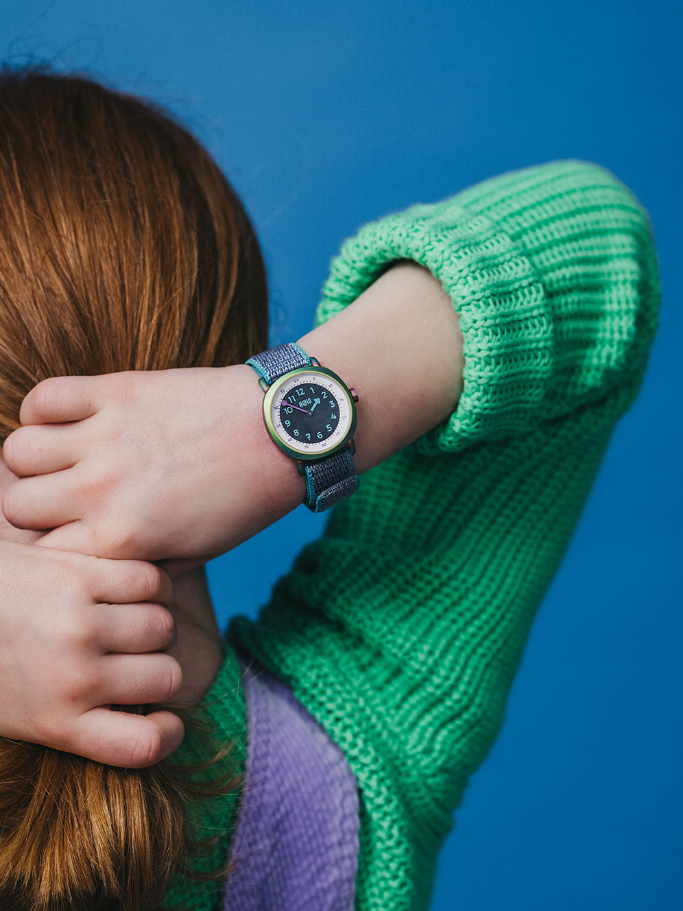Die KWIO TIKK und ihre große Schwester, die KWIO TAKK, unterstützen Kinder beim Uhrenlernen mit durchdachtem Design und klarem Fokus. Beide Modelle setzen auf ein kontrastreiches Zifferblatt und stilistische Klarheit. Während die TIKK mit kindgerechtem Klettband und einem begleitenden Booklet zu gemeinsamen Lernmomenten einlädt, bietet die TAKK zusätzlich eine Datumsanzeige und einen Sekundenzeiger – ideal für ältere Kinder oder solche, die eine größere Uhr bevorzugen.