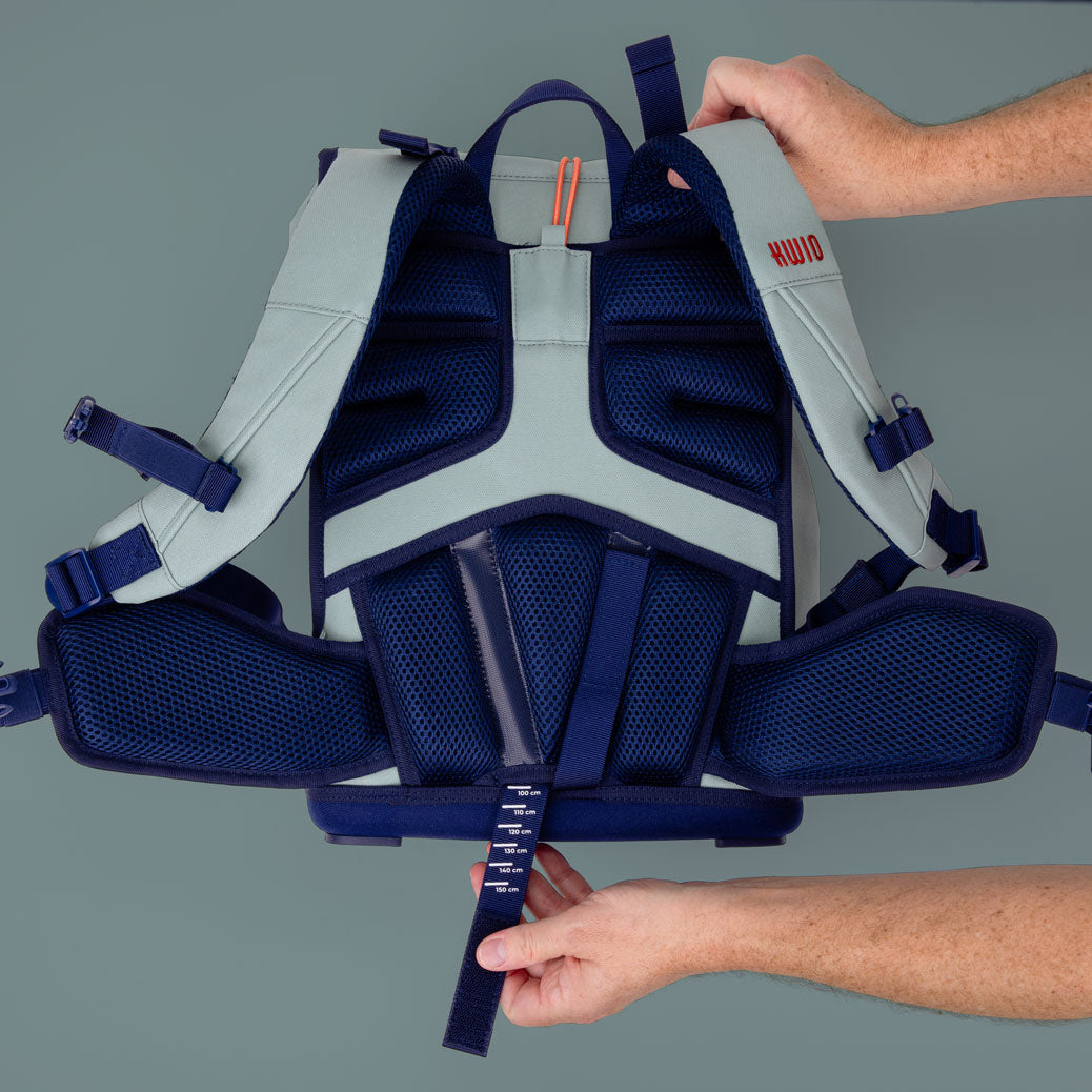 Unser ergonomisches Tragesystem ist mit weichen Gurten und einer starken Polsterung am Rücken ausgestattet. Um mit den Kindern mitzuwachsen, verändert sich die Weite des Tragesystems mit der Einstellung der Länge der Schultergurte. So kann der Rucksack mit einer Körpergröße von 100 cm - 150 cm getragen werden.