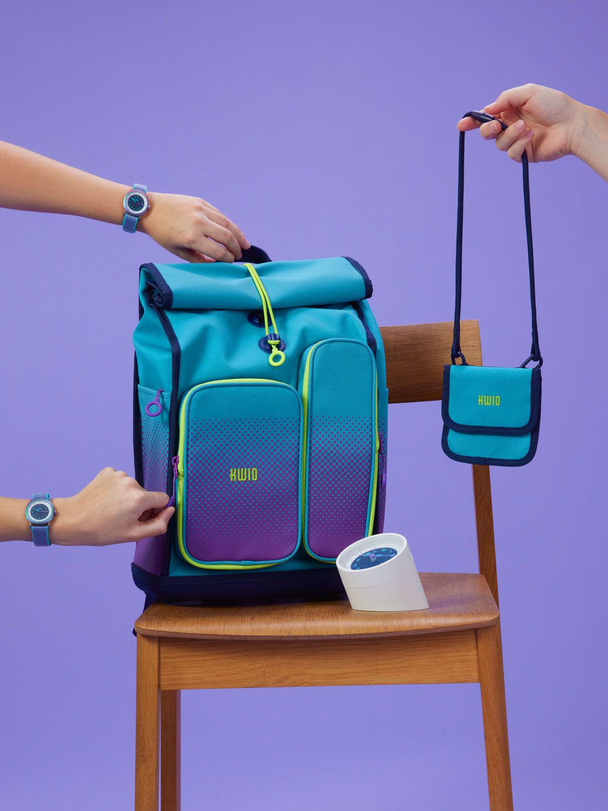 Das tiefe Türkis wird durch einen violetten Punkteverlauf und neongelbe Highlights modern und auffällig in Szene gesetzt – ein Look, der auffällt, ohne laut zu sein.
