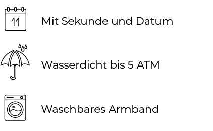 Die Uhr besteht aus einem soliden Edelstahlgehäuse. Das robuste K1 Mineralglas verhindern schnelles Verkratzen. Zudem ist die Uhr wasserdicht bis zu 5 ATM.